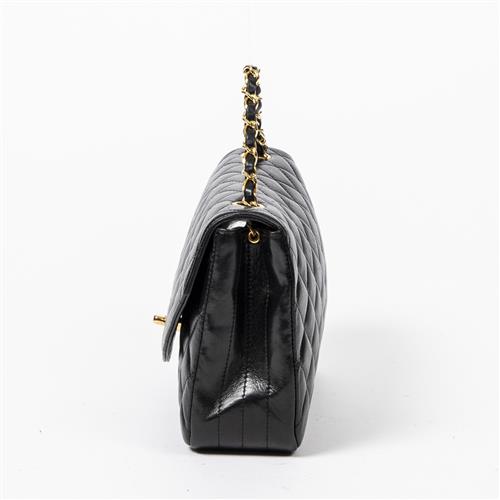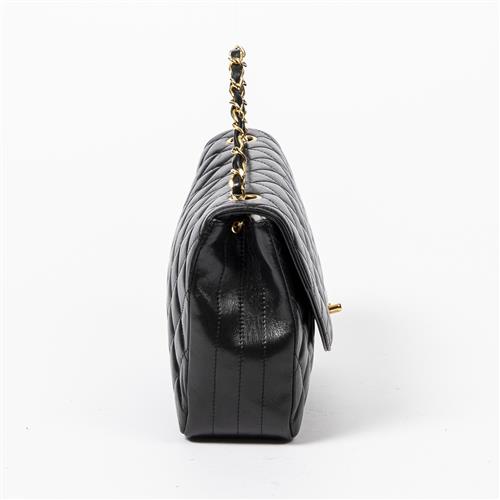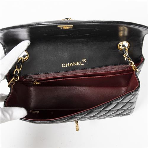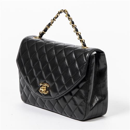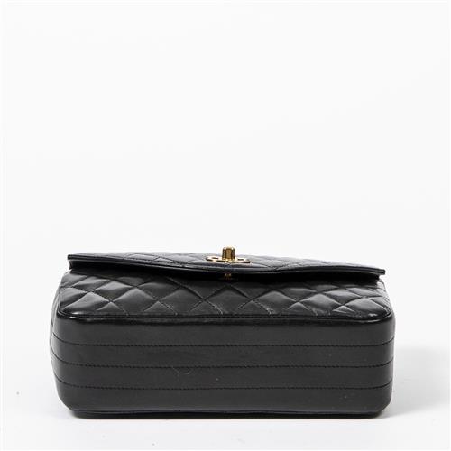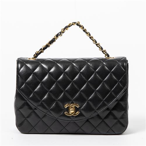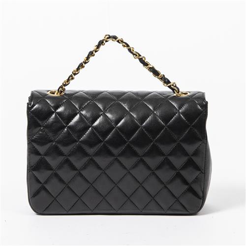 Styled in back quilted leather with interlaced chain strap and gold tone hardware, 22 x 15 x 7cm.