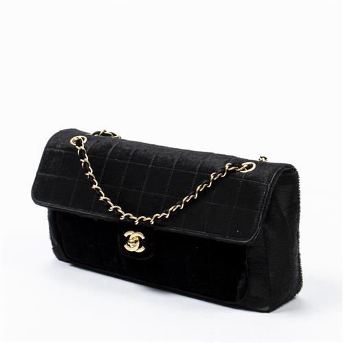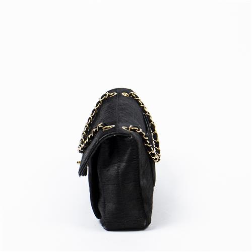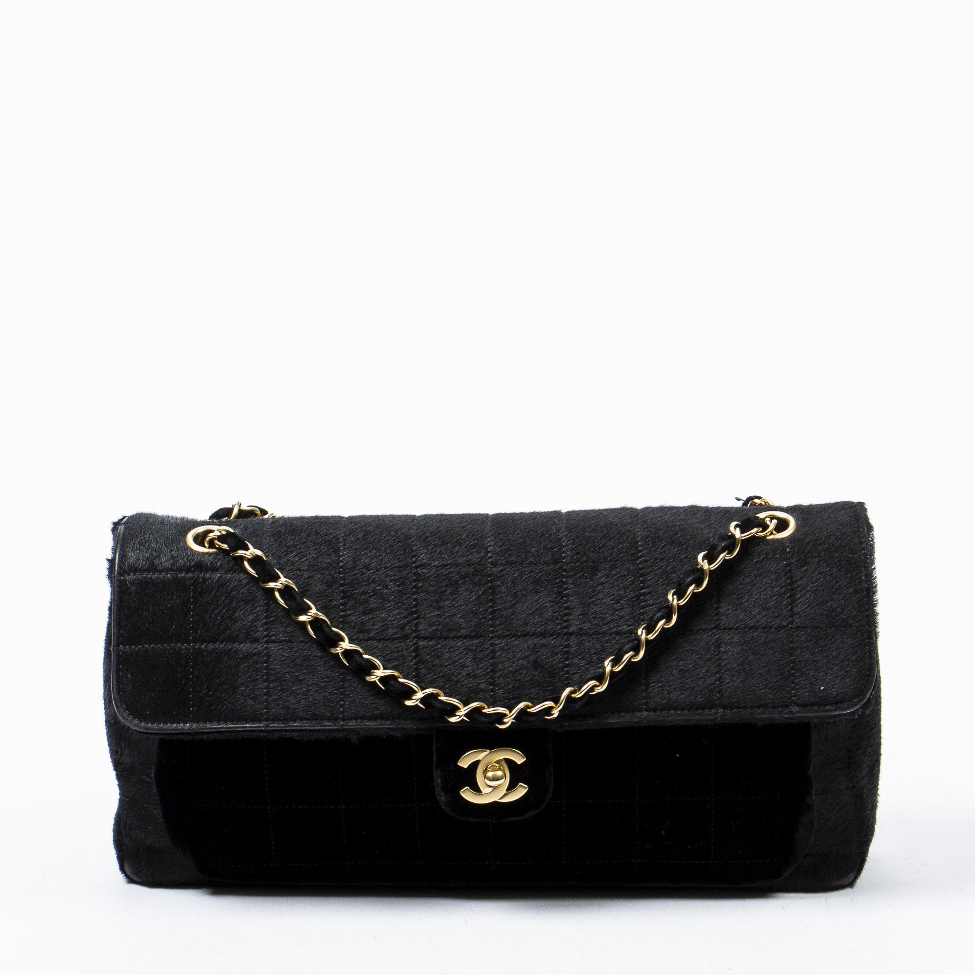 Styled in black pony hair with interlaced black velvet chain shoulder strap and gold tone hardware, 25 x 5 x 15cm.