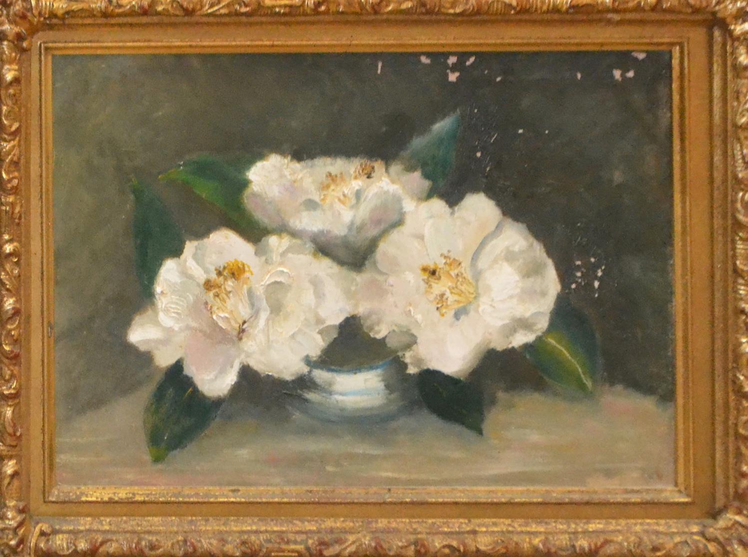 ARTIST UNKNOWN, CAMELIAS, OIL ON BOARD, 25 X 35CM, FRAME: 41 X 52CM, CONDITION: THIS ARTWORK IS IN FAIR CONDITION, PAINT LOSSES TO THE CENTRE RIGHT HAND SIDE AND MINOR DISCOLOURATION AND WEAR TO THE EDGES OF FRAME
