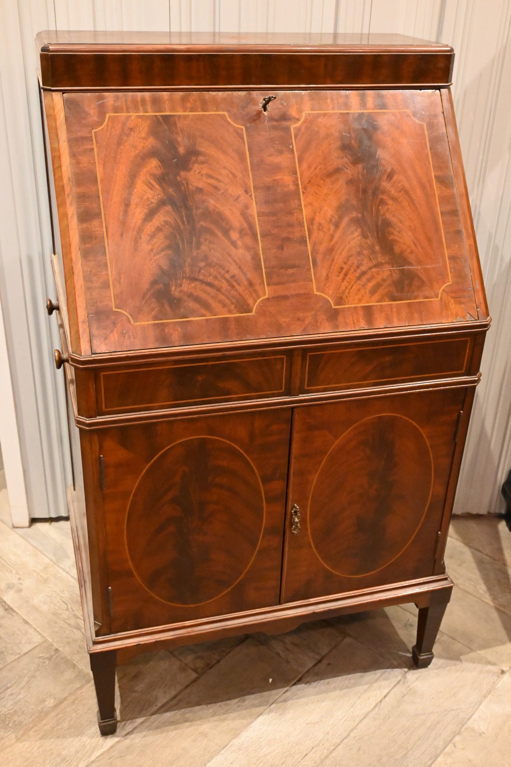 AN ANTIQUE GENTLEMANS COCKTAIL CABINET IN THE MANNER OF A BUREAU. WITH STRING INLAY AND DROP DOWN FRONT TO REVEAL FITTED INTERIOR c1940's (A/F) (117H X 70W X 50D CM) (PLEASE NOTE THIS HEAVY ITEM MUST BE REMOVED BY CARRIERS AT THE CUSTOMER'S EXPENSE. LEONARD JOEL STAFF CANNOT ASSIST CARRYING THIS ITEM) (X-LARGE ITEM)