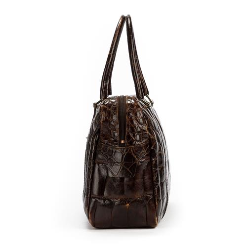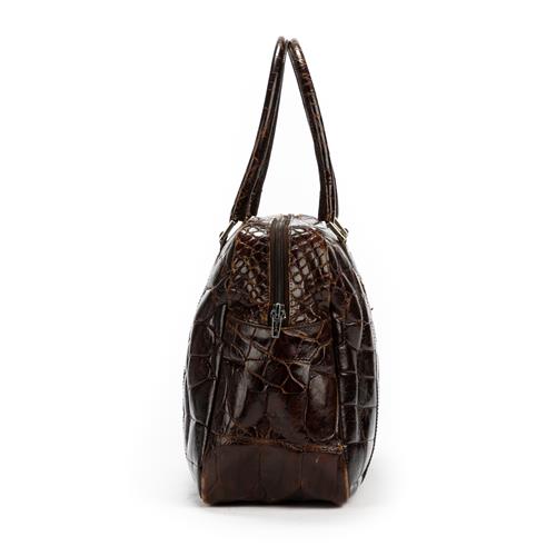 Styled in brown python leather and silver tone hardware, 28 x 49 x 16cm.