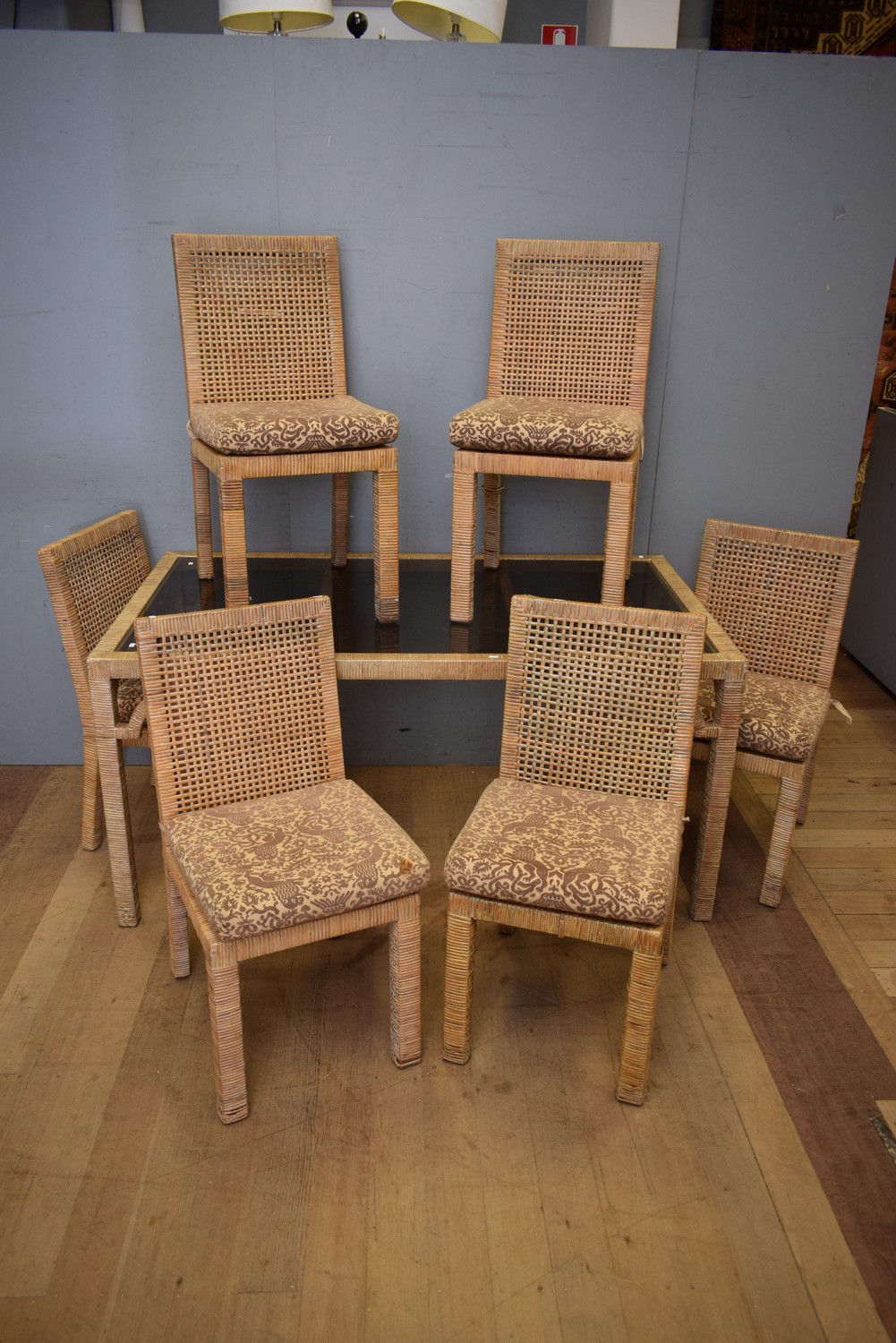 A CANE DINING TABLE WITH SIX CHAIRS (A/F) (74H x 152W x 87D CM) (PLEASE NOTE THIS HEAVY ITEM MUST BE REMOVED BY CARRIERS AT THE CUSTOMER'S EXPENSE. LEONARD JOEL STAFF CANNOT ASSIST CARRYING THIS ITEM) (X-LARGE ITEM)