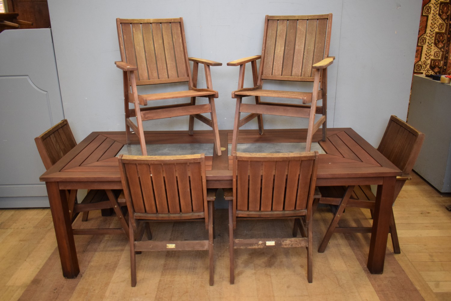 A SEVEN PIECE OUTDOOR SETTING INCLUDING GRANITE INSERT TO TABLE (A/F) (H76 X W220 X D100 CM) (PLEASE NOTE THIS HEAVY ITEM MUST BE REMOVED BY CARRIERS AT THE CUSTOMER'S EXPENSE. LEONARD JOEL STAFF CANNOT ASSIST CARRYING THIS ITEM) (X-LARGE ITEM)