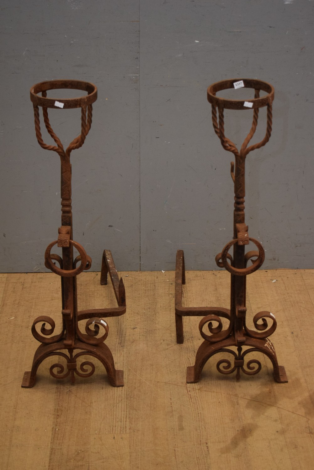A PAIR OF FRENCH WROUGHT IRON FIREPLACE ANDIRONS (H90 X W31 X D61 CM) (PLEASE NOTE THIS HEAVY ITEM MUST BE REMOVED BY CARRIERS AT THE CUSTOMER'S EXPENSE. LEONARD JOEL STAFF CANNOT ASSIST CARRYING THIS ITEM) (X-LARGE ITEM)