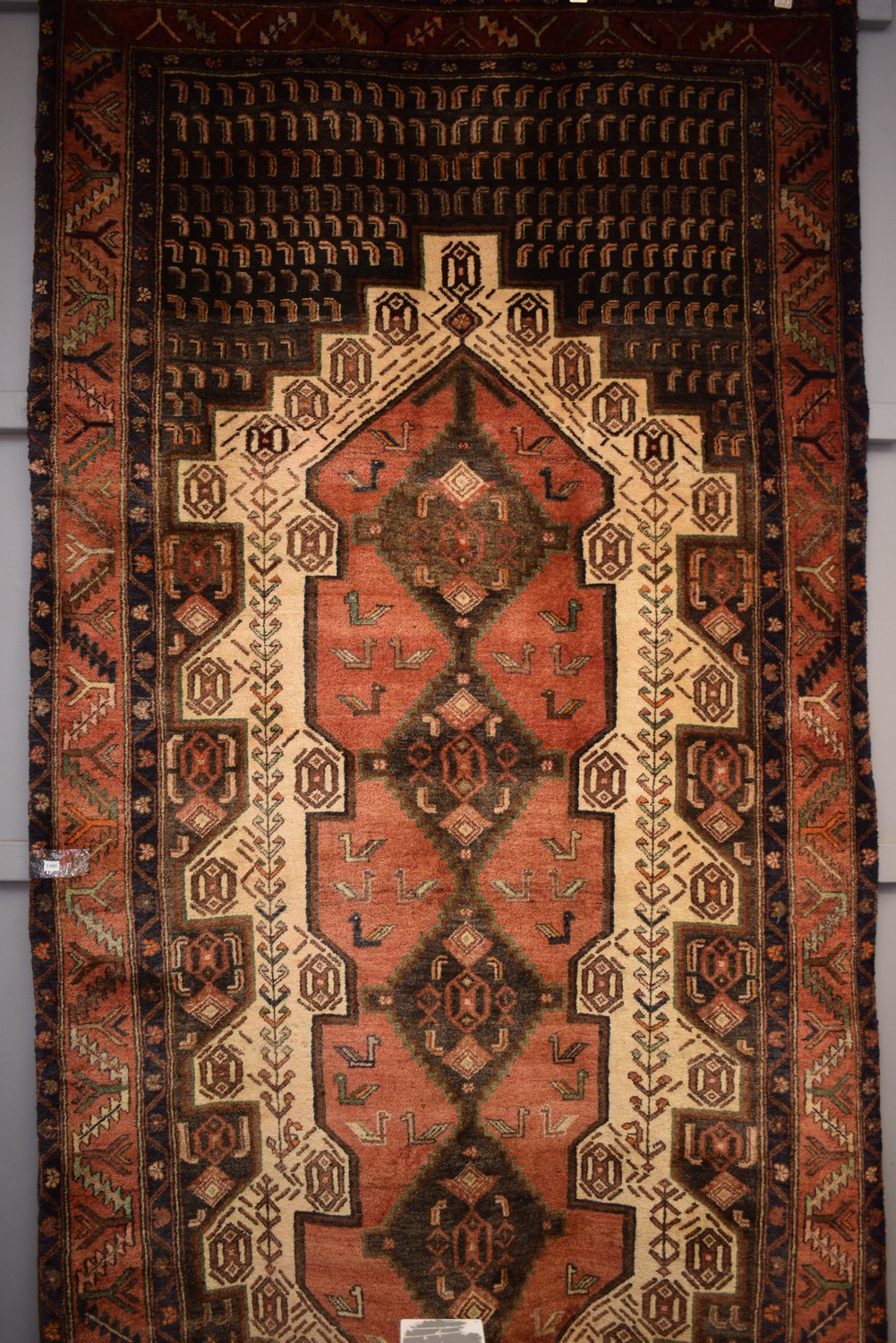 A COLLECTABLE HAND-KNOTTED PERSIAN SENNEH RUG, 100% WOOL ABRASH PILE, SOLID AND DENSE. VILLAGE WEAVE FROM THE KURDISTAN REGION WITH TRIBAL DESIGN OF HOOKED MEDALLIONS IN A PRIMARY RUST-TONED FIELD AND SECONDARY FIELD OF HERATI MAHI PATTERNS. FLORAL-PATTERNED BORDER. SIZE: 313X153CM ORIGIN: IRAN - RRP: $3,800 CERTIFICATE OF AUTHENTICITY INCLUDED