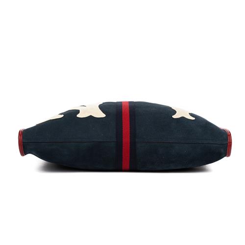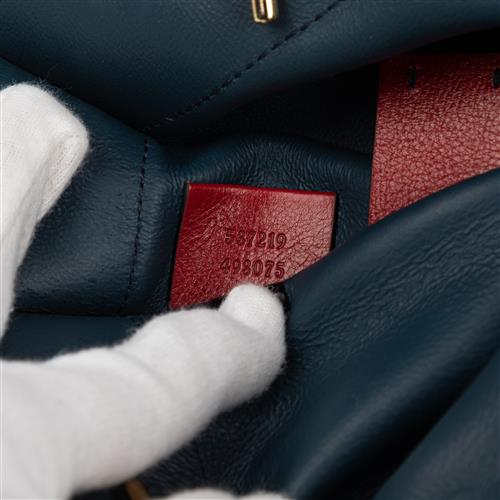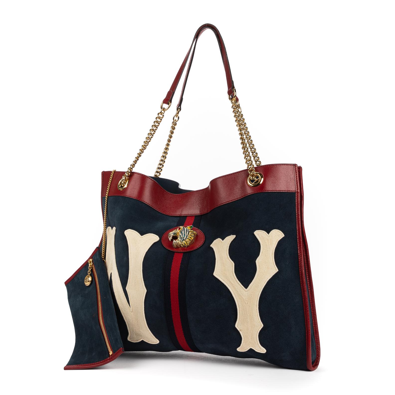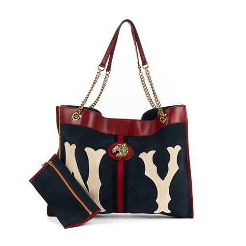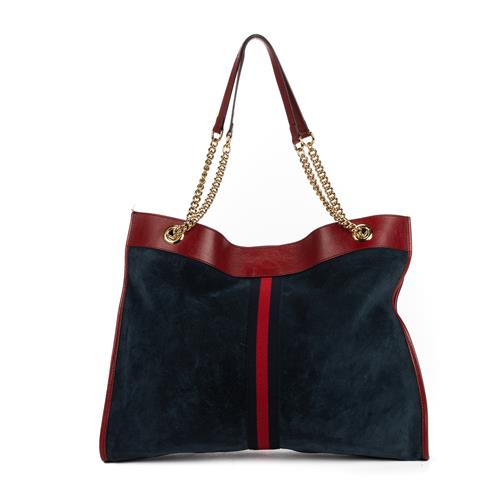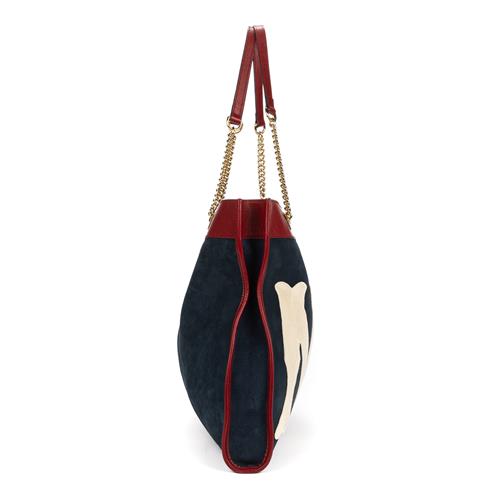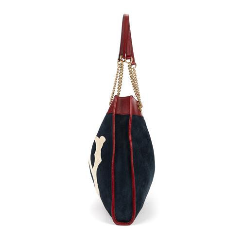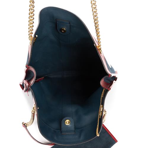 Styled in navy and red leather with a gold chain strap and gold hardware, 45 x 35 x 6cm.