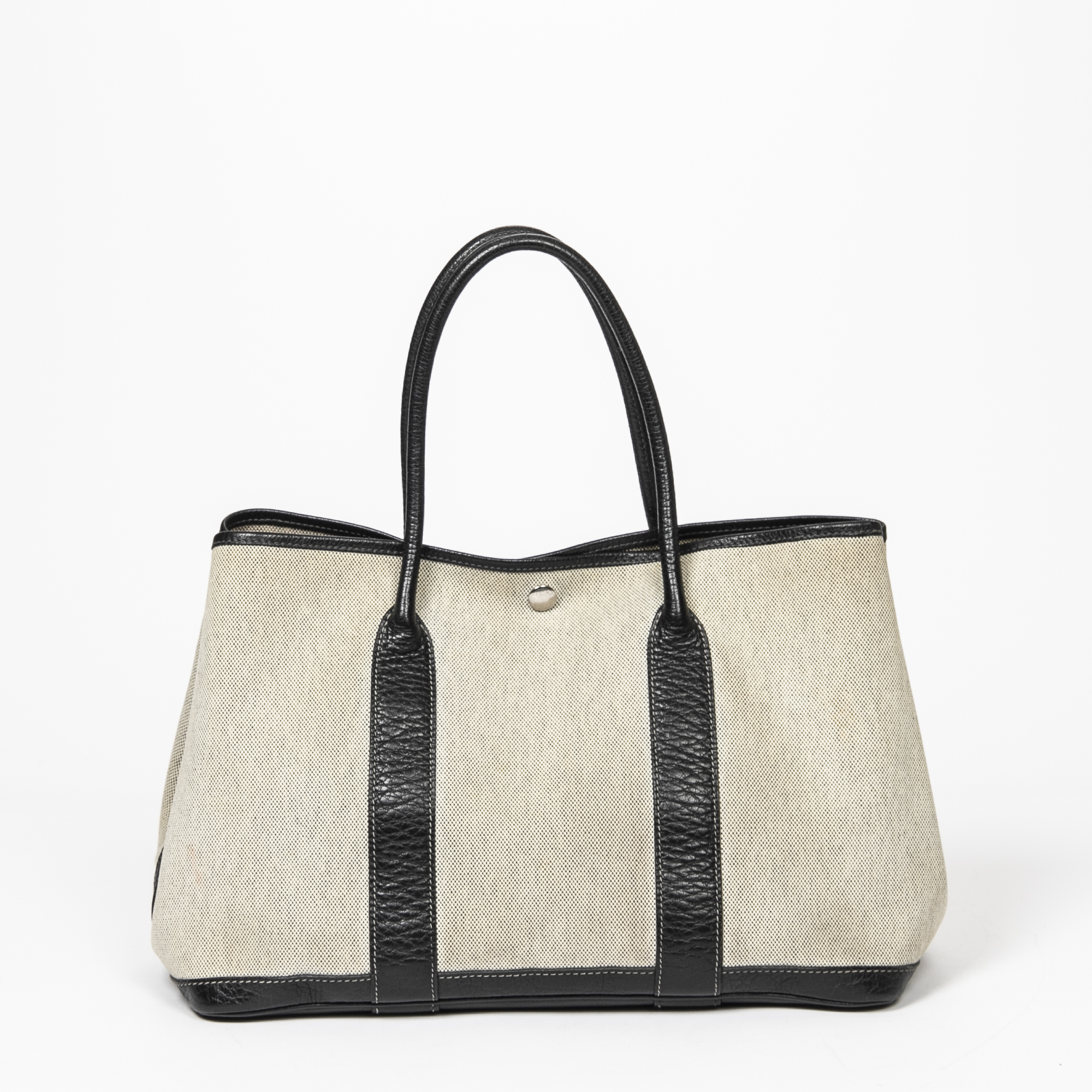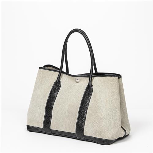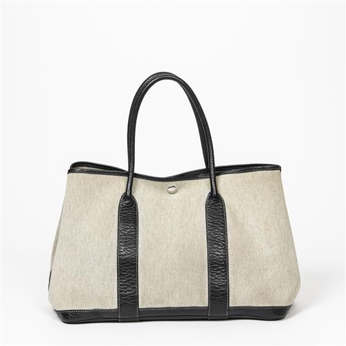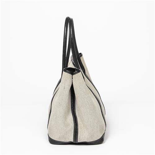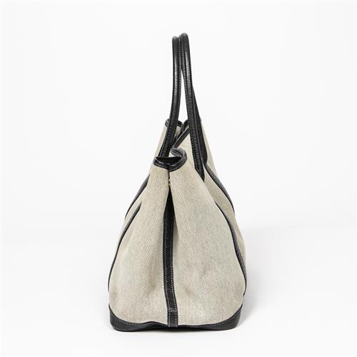 Styled in beige canvas with a black leather strap with silver tone hardware, 35 x 24 x 17cm.