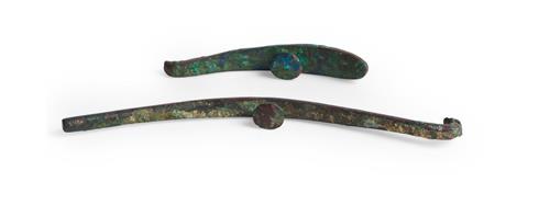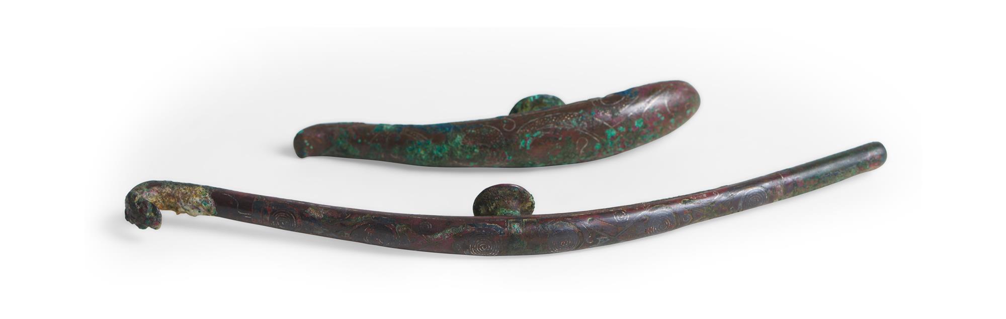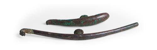 The shorter hook with lost dragon's head. Both with wear, losses to inlay, and verdigris encrustation