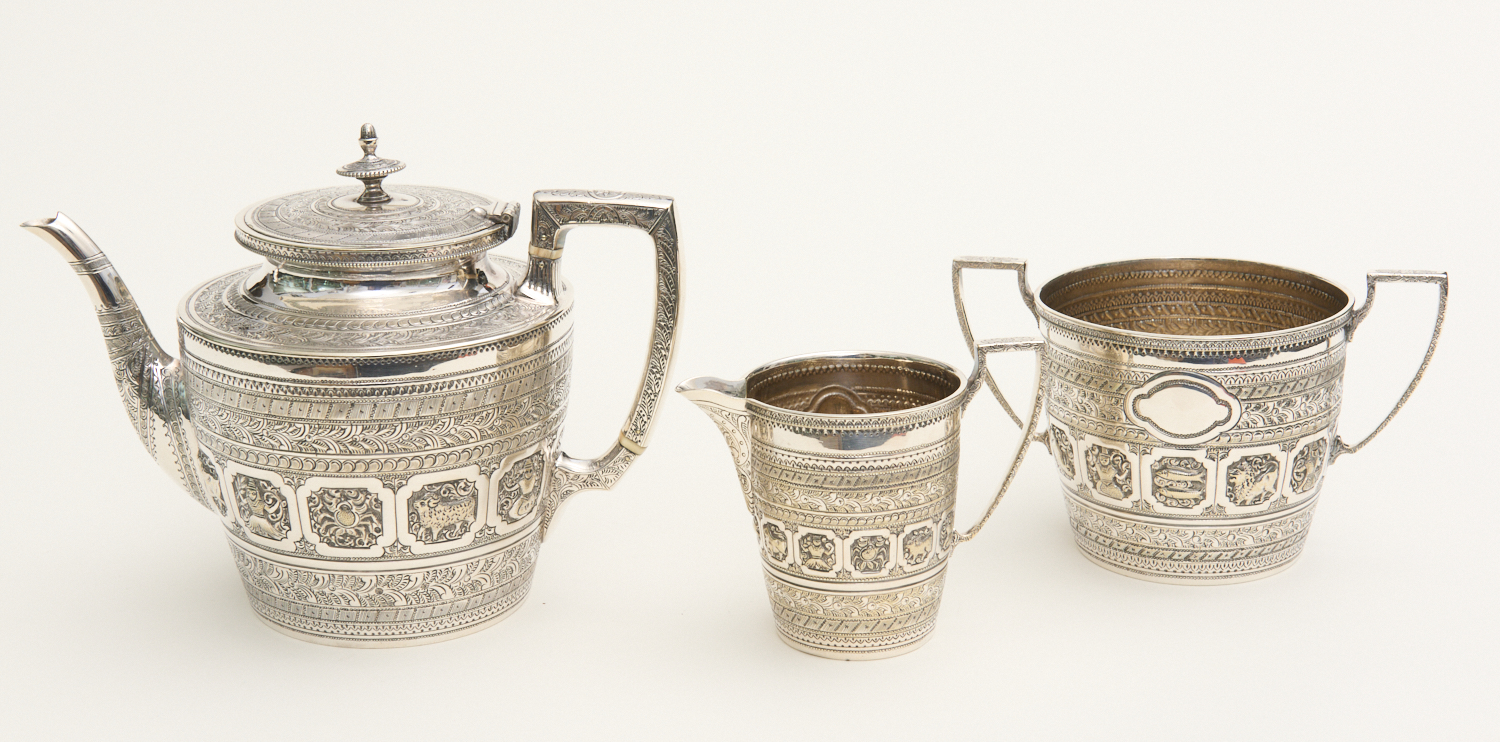 A SILVER PLATE TEA SET WITH ZODIAC DESIGN. LJ DELIVERY SIZE: SMALL