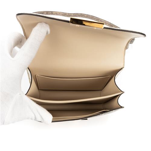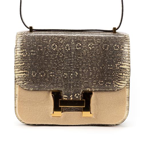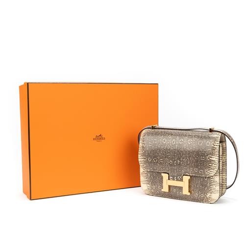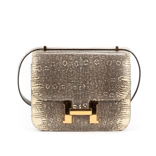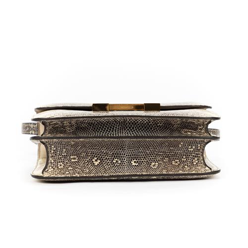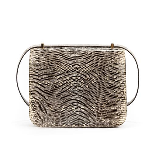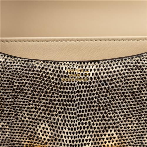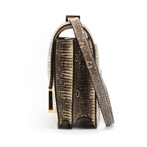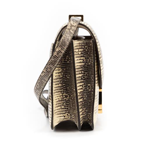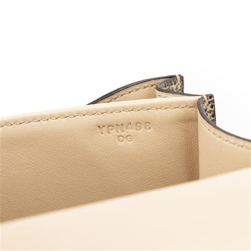 Styled in beige lizard leather and gold tone hardware, 18 x 14.5 x 4cm.