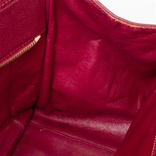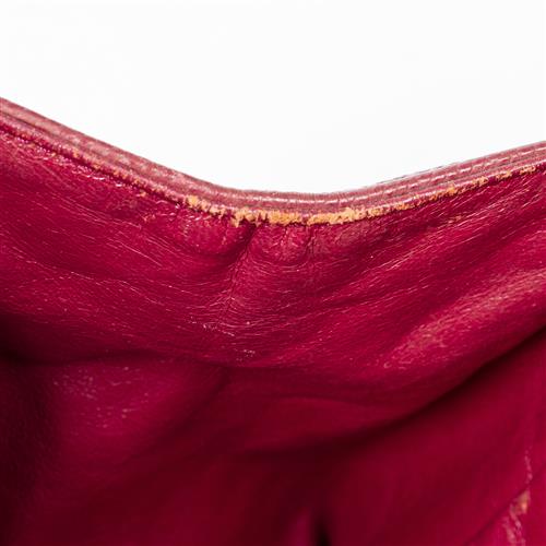 Styled in raspberry quilted leather with interlaced chain shoulder strap and brushed gold tone metal hardware, 32 x 17 x 24cm.