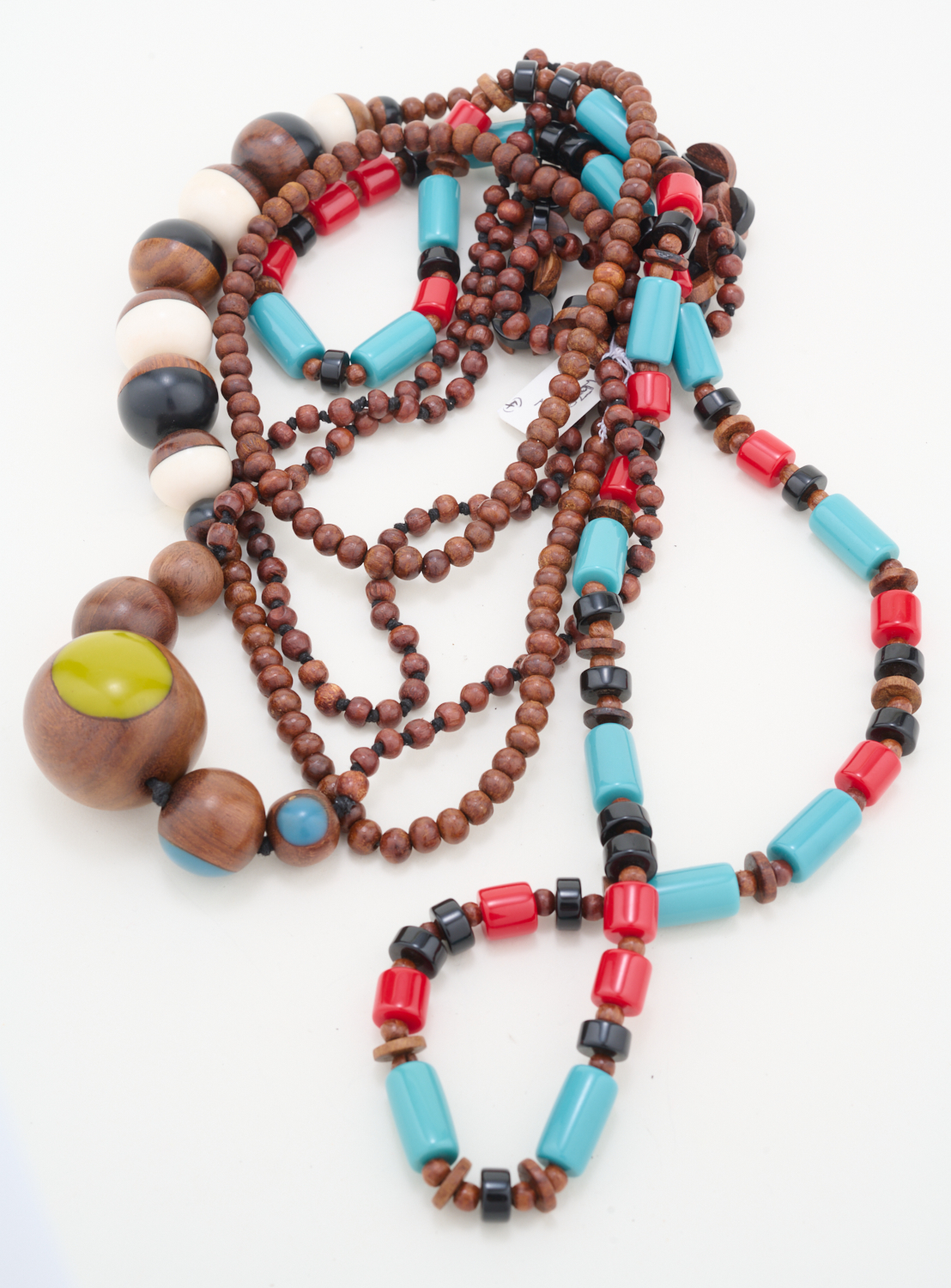 A COLLECTION OF WOOD AND RESIN JEWELLERY BY MARIMEKKO, INCLUDING THREE LONG BEAD NECKLACES AND AN EXPANDABLE BRACELET