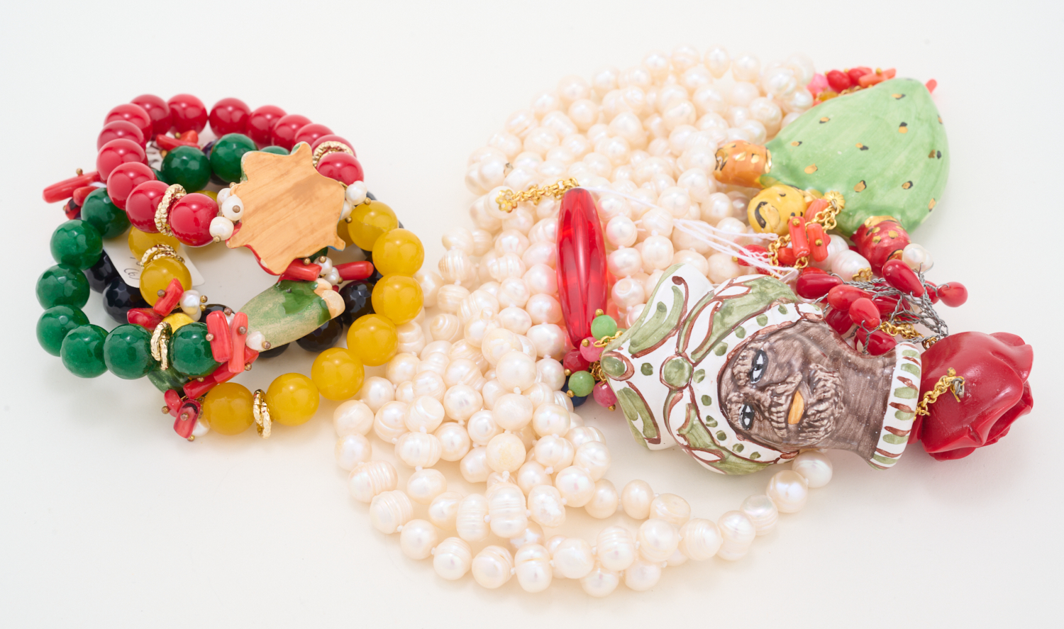 A COLLECTION OF PEARL, CORAL, RESIN, GLASS AND CERAMIC SICILIAN JEWELLERY, INCLUDING TWO PEARL NECKLACES AND FOUR EXPANDABLE GLASS BEAD BRACELETS EMBELLISHED WITH PAINTED CERAMIC MOTIFS IN THE FORM OF A BLACKAMOOR, CACTI, CLASSICAL FEMALE MASK, FRUITS AND FLOWERS