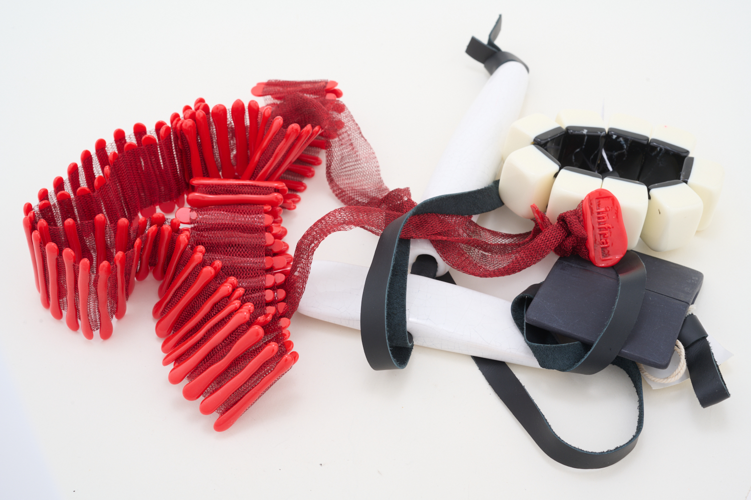 A COLLECTION OF JEWELLERY INCLUDING A SCULPTURAL FORM CERAMIC AND LEATHER NECKLACE BY IVONA, A RED PLASTIC AND MESH NECKLACE BY INFRA, BLACK AND WHITE EXPANDABLE BRACELET BY MARNI FOR H&M