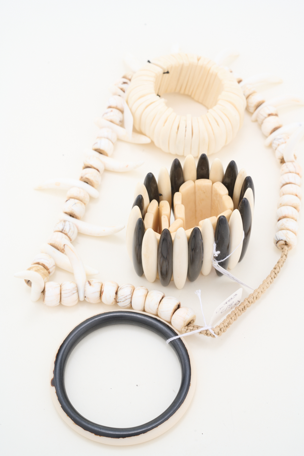 A COLLECTION OF TRIBAL INSPIRED JEWELLERY INCLUDING THREE EXPANDABLE BRACELETS, A BANGLE AND BONE BEAD NECKLACE