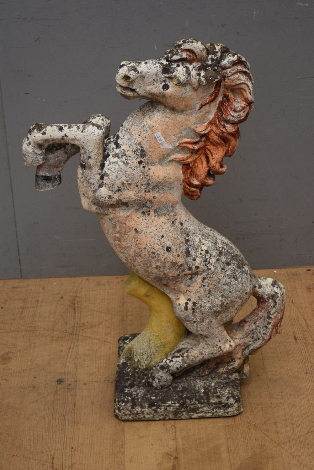 A FRENCH RECONSTITUTED STONE REARING HORSE GARDEN FIGURE STATUE <(80H X 55W X 22D CM) (PLEASE NOTE THIS HEAVY ITEM MUST BE REMOVED BY CARRIERS AT THE CUSTOMER'S EXPENSE. LEONARD JOEL STAFF CANNOT ASSIST CARRYING THIS ITEM) (X-LARGE ITEM)