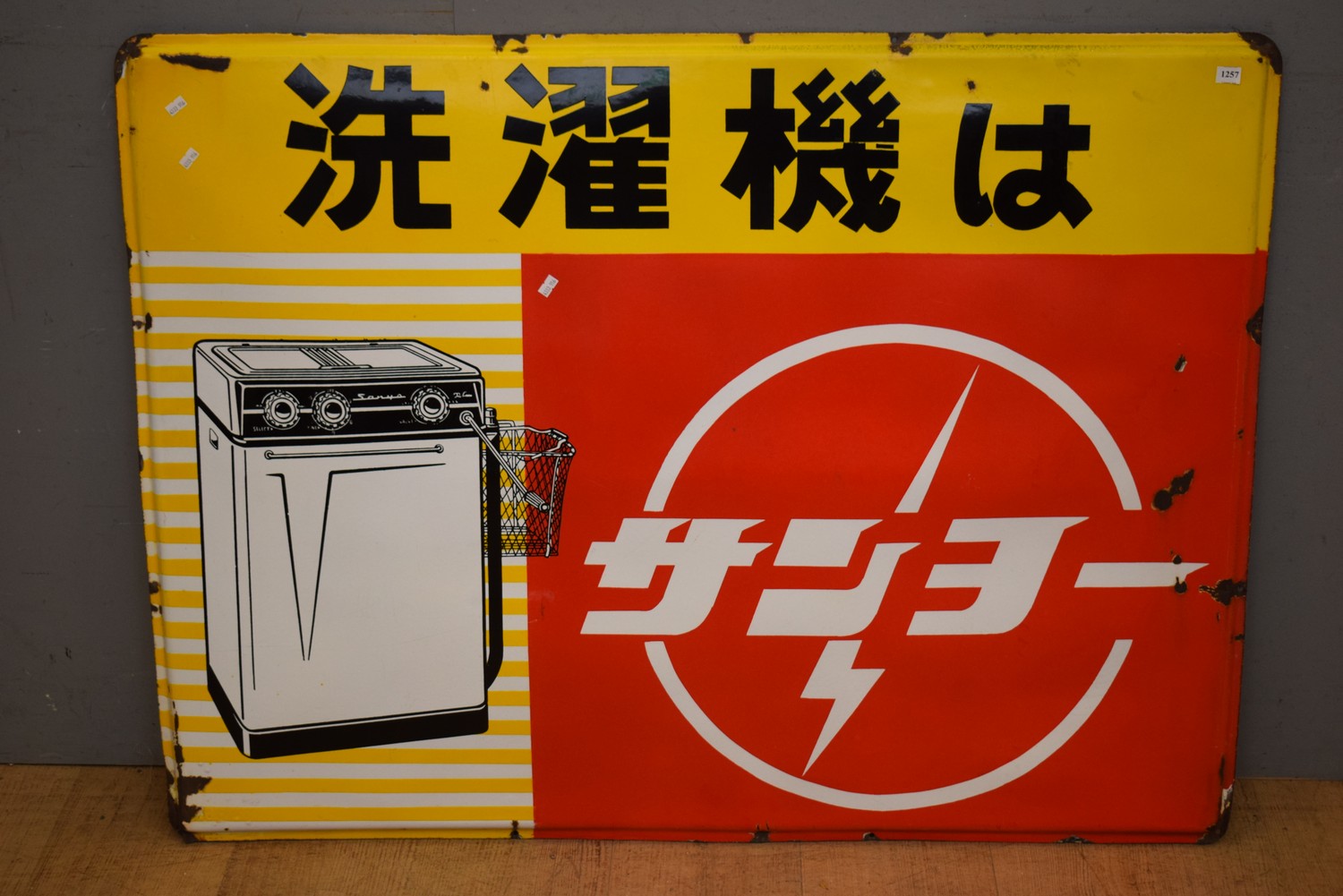 RARE 1950S LARGE JAPANESE YELLOW RED AND BLACK ENAMEL WASHING MACHINE SIGN ( 92H X 122W CM) (LEONARD JOEL DELIVERY SIZE: MEDIUM)