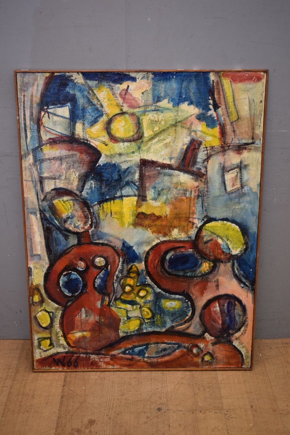 A LARGE 1960S AUSTRALIAN RETRO OIL ON BOARD, PEOPLE AT TABLE BY WIEBENGA, DATED 1966, ACQUAINTANCE OF LEONARD FRENCH (124H x 93W CM) (LEONARD JOEL DELIVERY SIZE: LARGE)