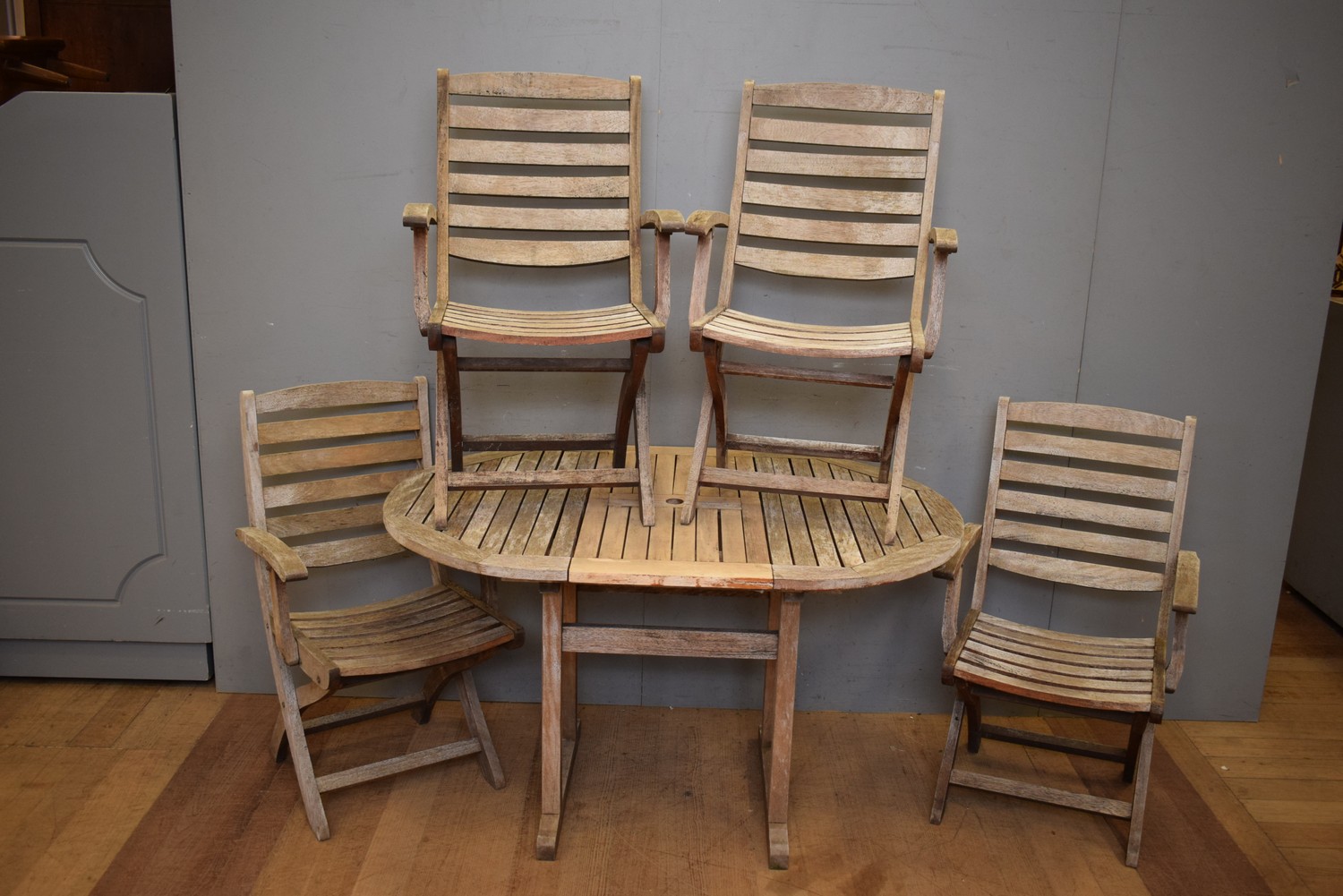 A FIVE PIECE TEAK 'SIROCCO' OUTDOOR SETTING (H74 X W129 X D90 CM) (PLEASE NOTE THIS HEAVY ITEM MUST BE REMOVED BY CARRIERS AT THE CUSTOMER'S EXPENSE. LEONARD JOEL STAFF CANNOT ASSIST CARRYING THIS ITEM) (X-LARGE ITEM)
