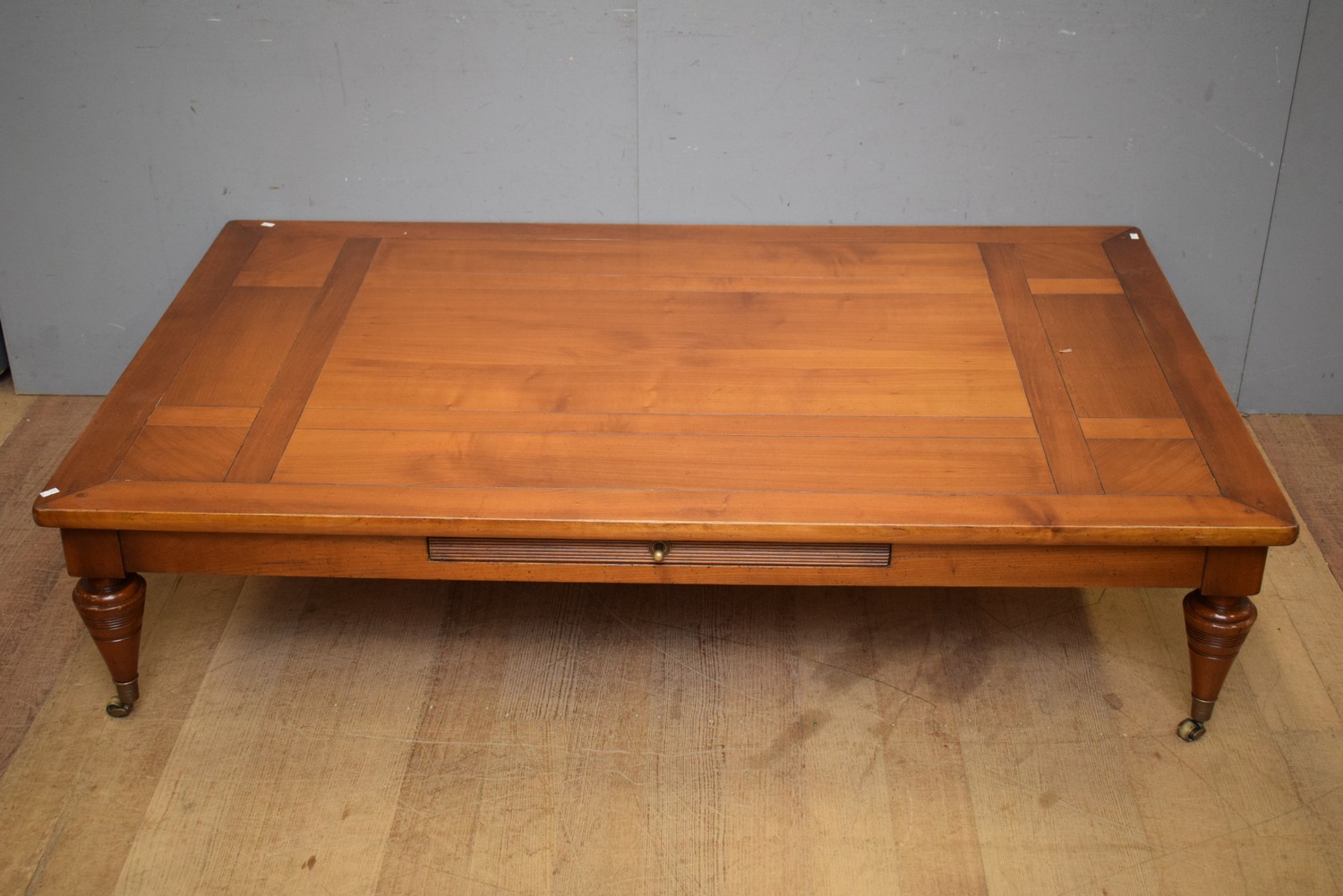 A PROVINICIAL STYLE LOWLINE COFFEE TABLE ON CASTORS ( 37H X 160W X 101D CM) (PLEASE NOTE THIS HEAVY ITEM MUST BE REMOVED BY CARRIERS AT THE CUSTOMER'S EXPENSE. LEONARD JOEL STAFF CANNOT ASSIST CARRYING THIS ITEM) (X-LARGE ITEM)
