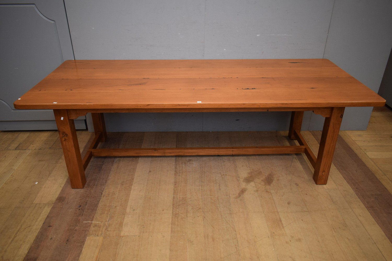A SUBSTANTIAL TIMBER DINING TABLE WITH STRETCHER BASE ( 77H X 241W X 99D CM) (PLEASE NOTE THIS HEAVY ITEM MUST BE REMOVED BY CARRIERS AT THE CUSTOMER'S EXPENSE. LEONARD JOEL STAFF CANNOT ASSIST CARRYING THIS ITEM) (X-LARGE ITEM)