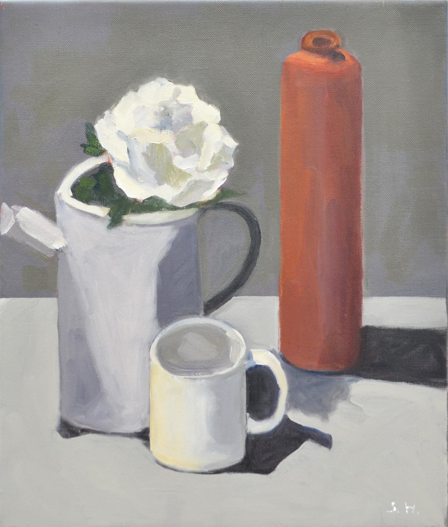 SUSAN HASE, TALL VASE AND FLOWER, OIL ON LINEN, 46 X 46CM