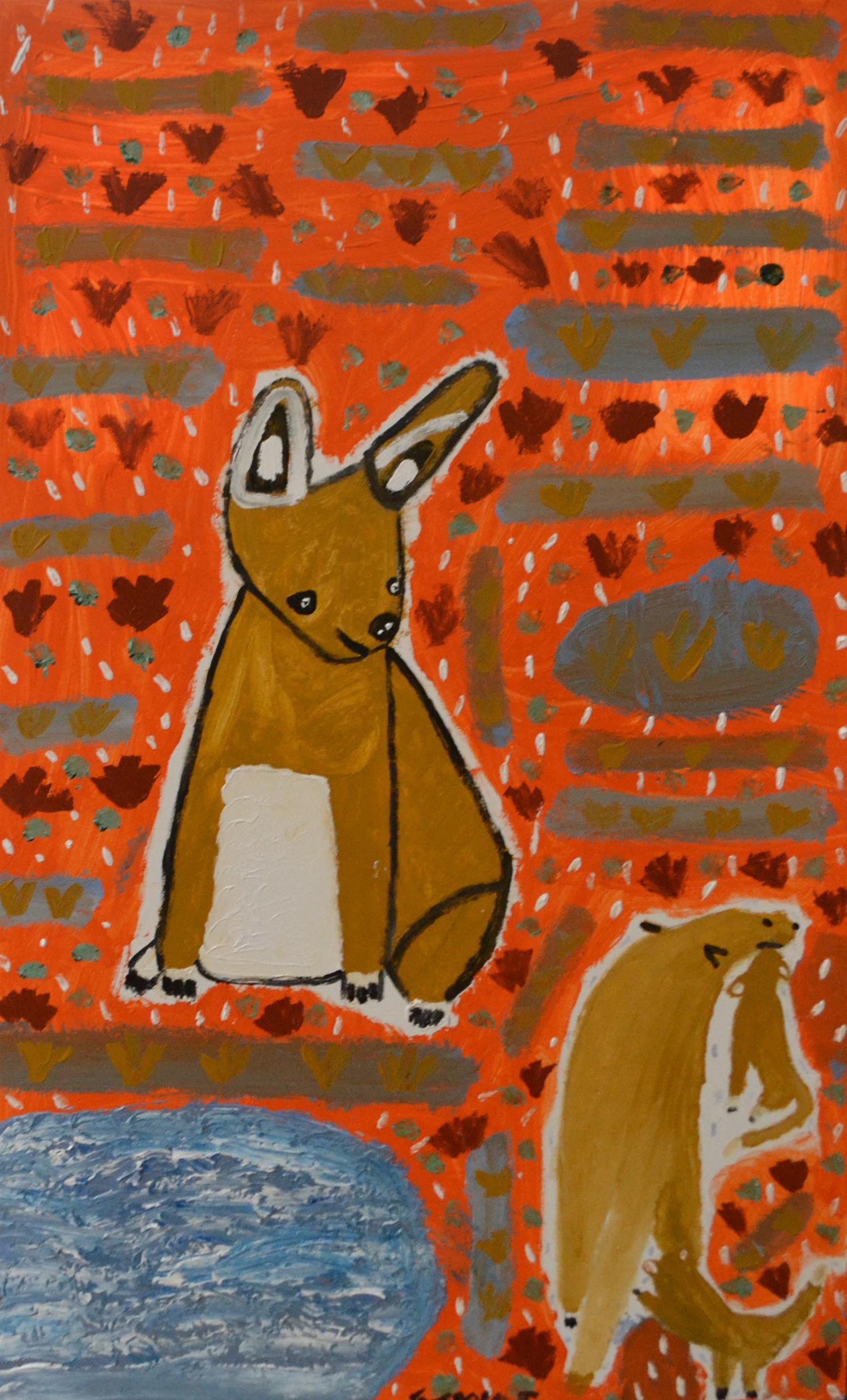 TURBO BROWN, MOTHER DINGO AND PUPS AT THE WATERHOLE, ACRYLIC ON CANVAS, 91 X 152CM, LEONARD JOEL DELIVERY SIZE: LARGE