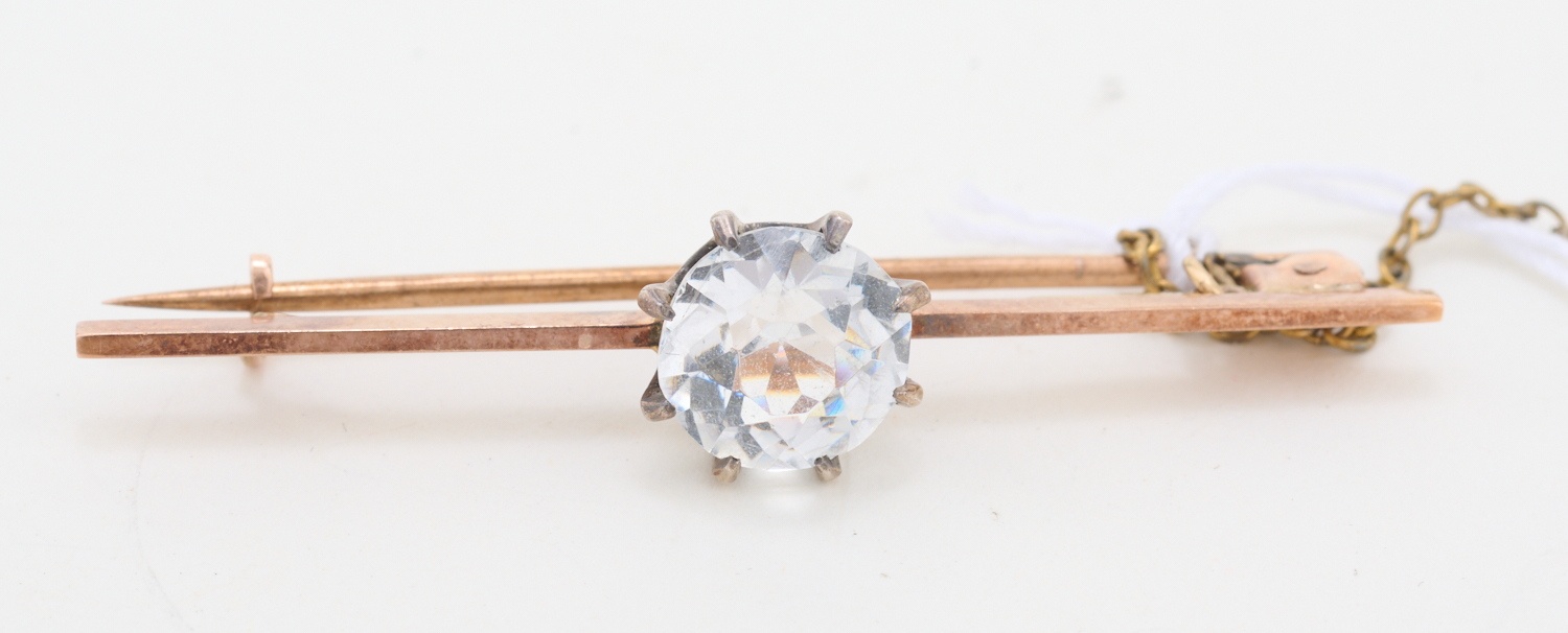 A TOPAZ SET BAR BROOCH IN 15CT GOLD AND SILVER