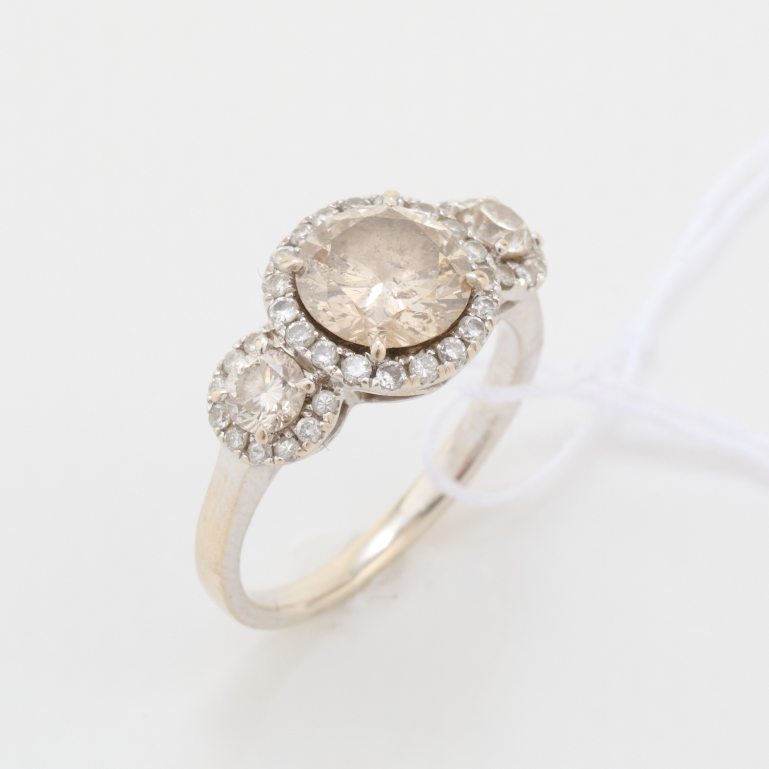 A TRIPLE CLUSTER CHAMPAGNE AND COLOURLESS DIAMOND RING IN 18CT WHITE GOLD, RING SIZE K/L, 4.2GMS