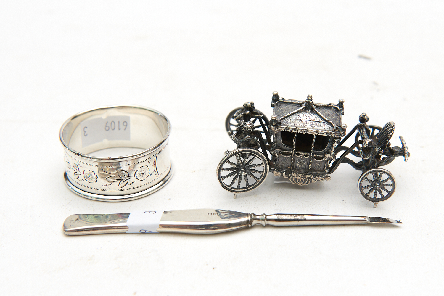 THREE ITEMS OF HALLMARKED STERLING SILVER INCLUDING SERVIETTE RING AND MODEL OF THE CORONATION COACH DATED 1951, LEONARD JOEL LOCAL DELIVERY SIZE: SMALL