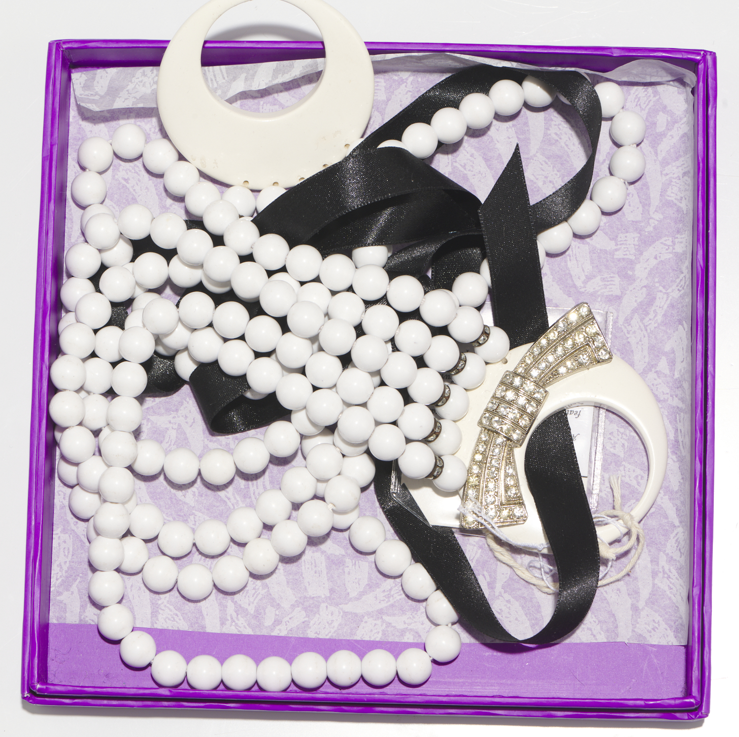 LIBERTY A VINTAGE FAUX HOWLITE, BONE, DIAMENTE AND TULLE NECKLACE ACCOMPANIED BY A LIBERTY LONDON BOX, TOTAL LENGTH APPROXIMATELY 90CM ADJUSTABLE