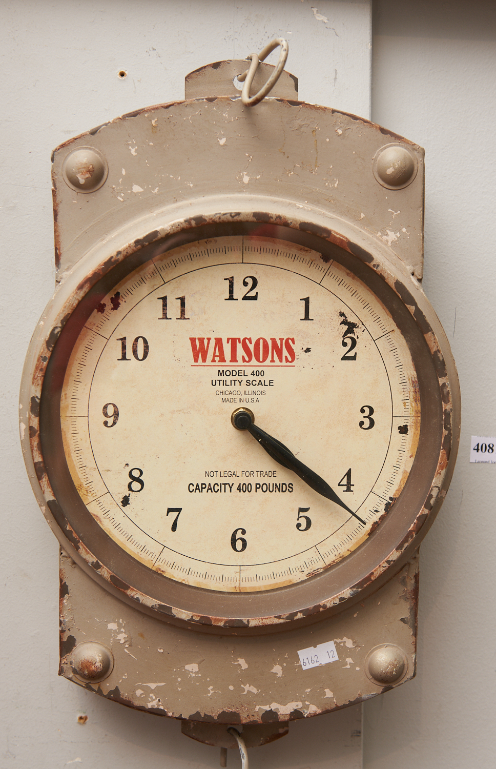 UNUSUAL VINTAGE ADVERTISING CLOCK IN THE FORM OF SCALES FOR WATSONS (42 CM H), LEONARD JOEL LOCAL DELIVERY SIZE: SMALL