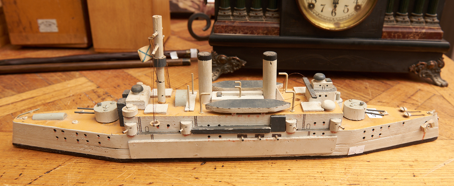 A WOODEN MILITARY BATTLESHIP W.57CM, LEONARD JOEL LOCAL DELIVERY SIZE: SMALL