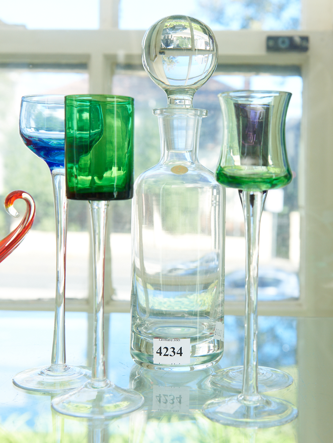 A GLASS DECANTER TOGETHER WITH FOUR HARLEQUIN LONG STEMMED LIQUEUR GLASSES, LEONARD JOEL LOCAL DELIVERY SIZE: SMALL