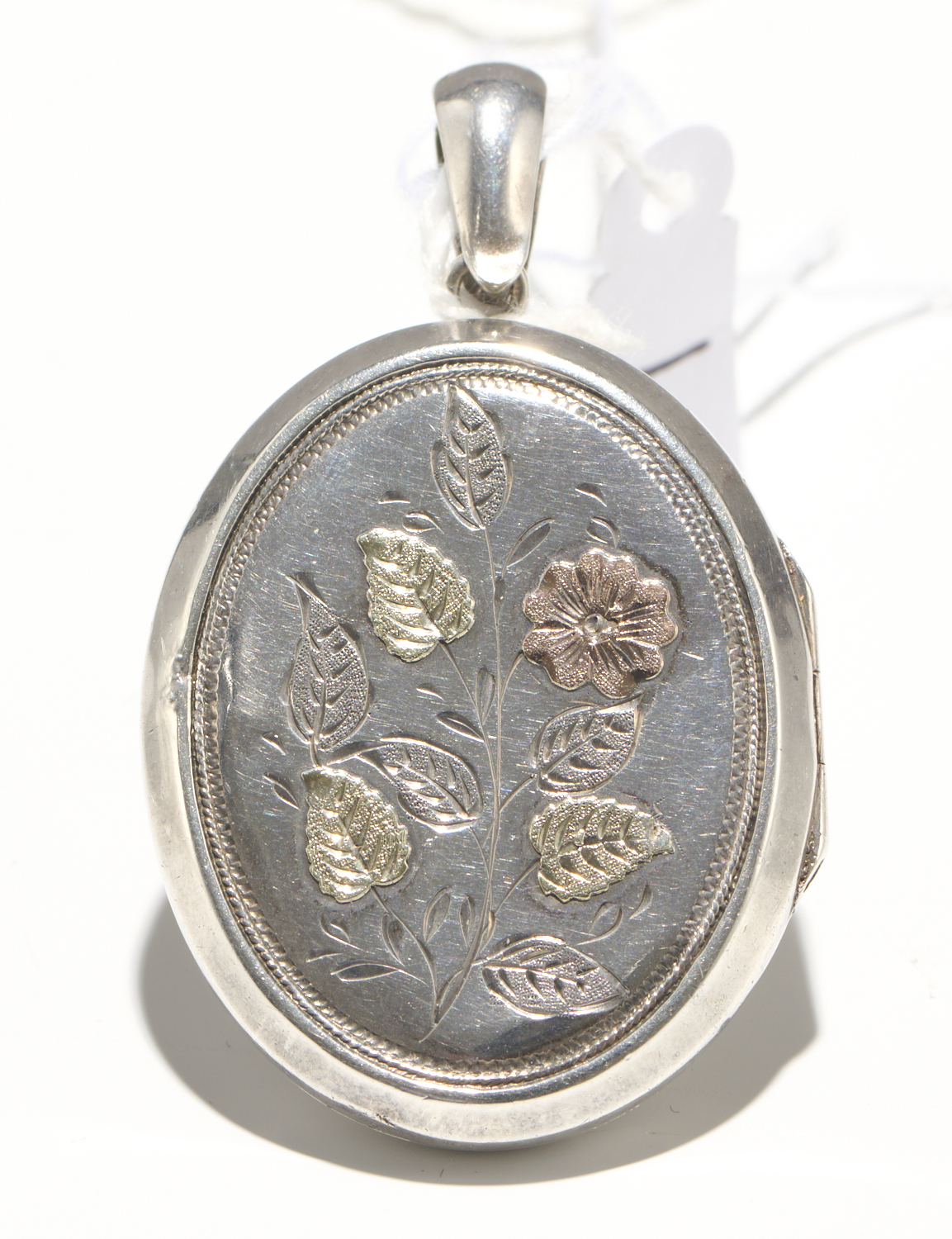 A SILVER AND APPLIED GOLD LOCKET, BIRMINGHAM 1881