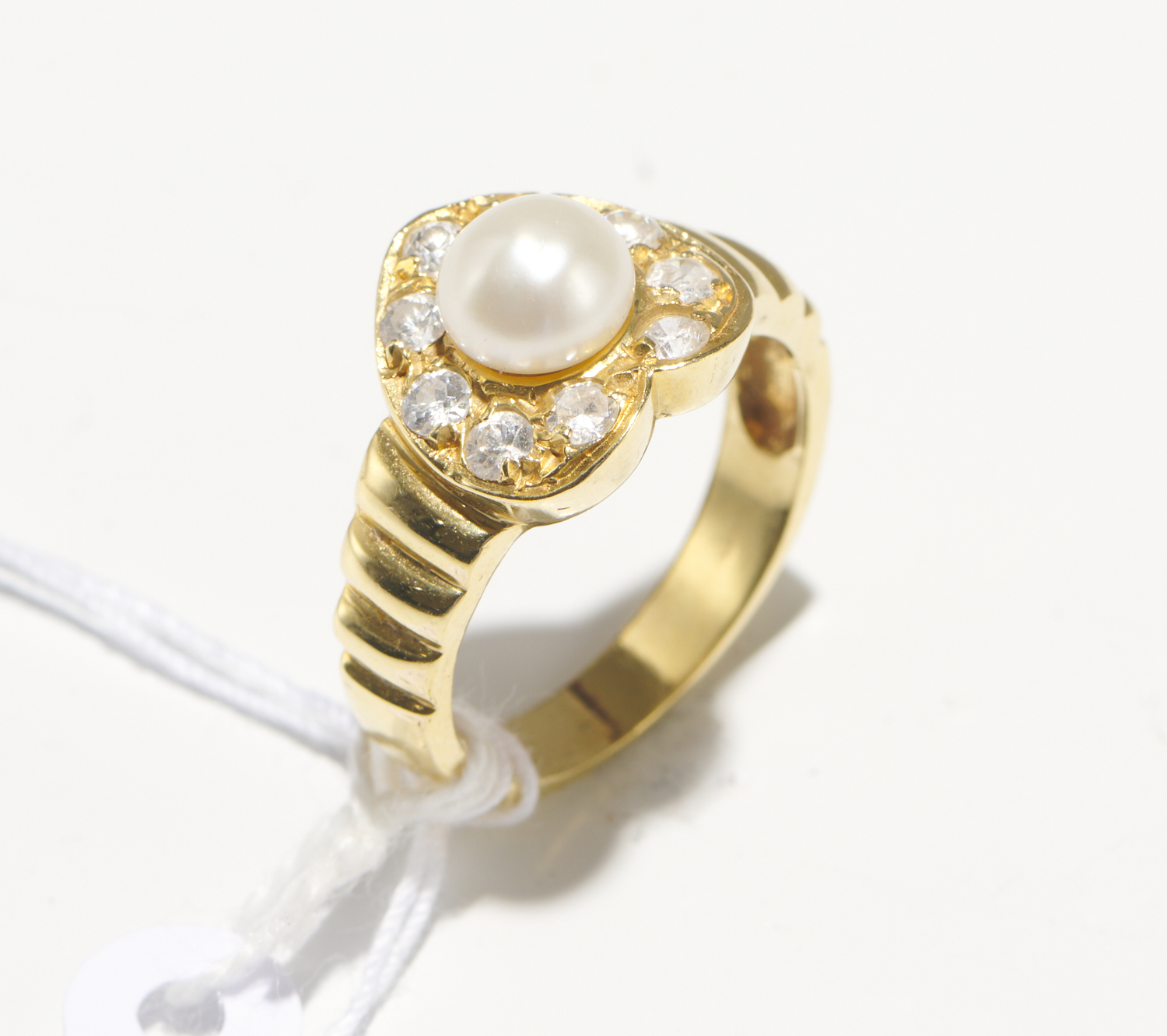 A WHITE STONE AND PEARL HEART RING IN 9CT GOLD