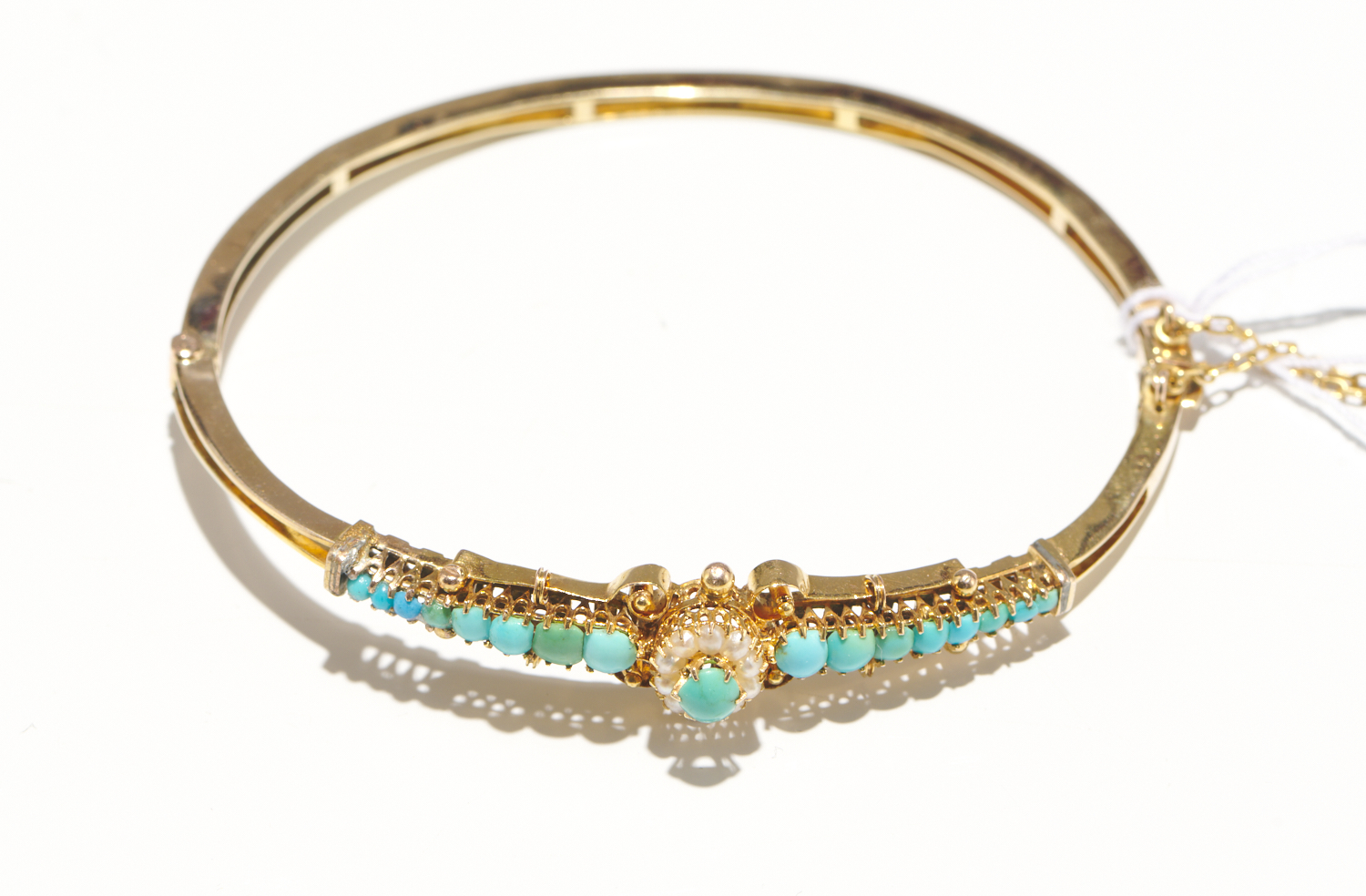 A SEED PEARL AND TURQUOISE BANGLE IN 9CT GOLD, CIRCA 1910, INNER DIAMETER 58MM