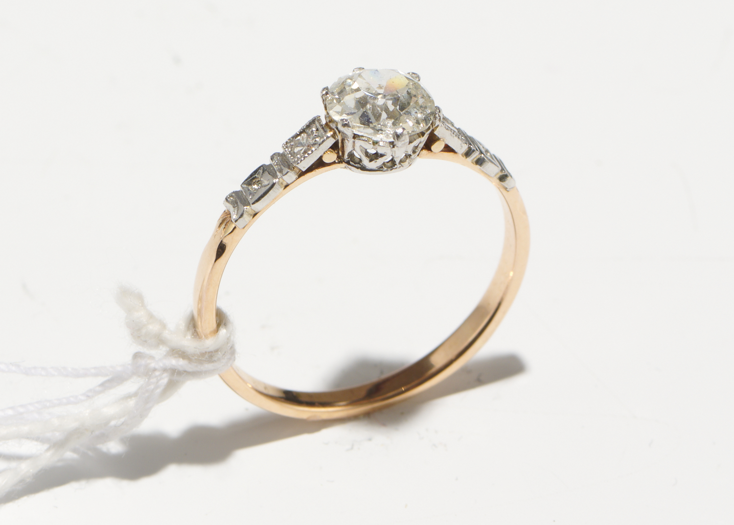 AN OLD CUT DIAMOND SOLITAIRE RING, WEIGHING AN ESTIMATED 0.95CTS, IN TWO TONE GOLD