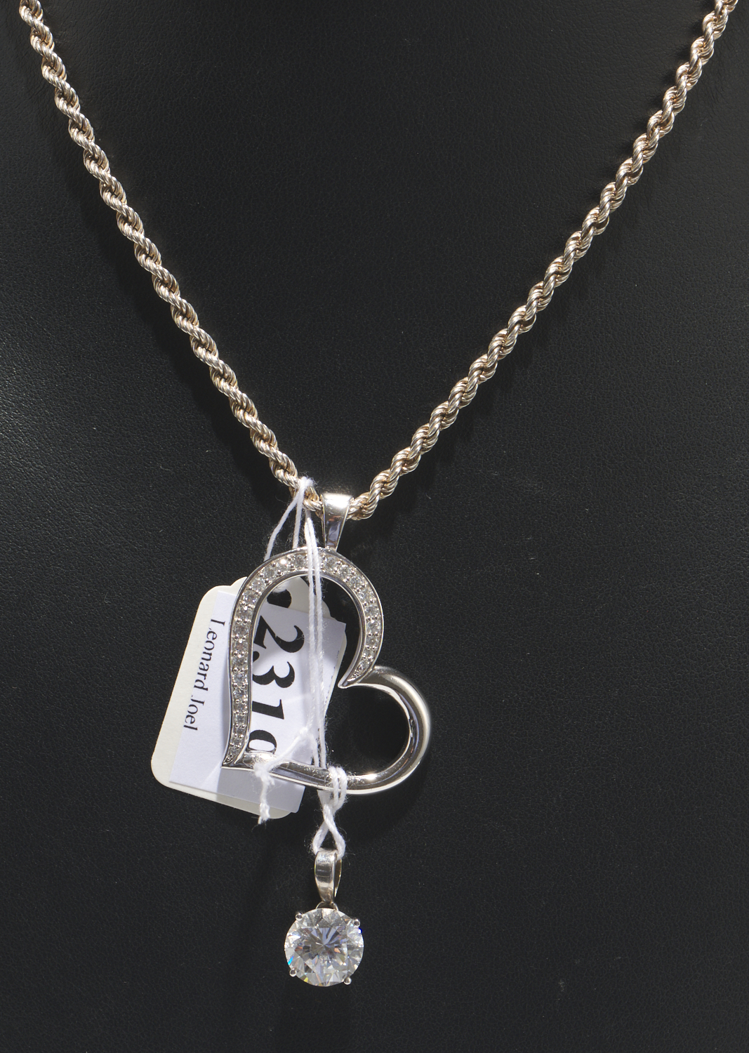 TWO SILVER? PENDANTS ONE DESIGNED AS AN OPENWORK HEART TO A ROPELINK CHAIN, LENGTH APPROXIMATELY 39.5CM; THE OTHER OF CIRCULAR DESIGN DIAMETER APPROXIMATELY 9MM, BOTH SET WITH CUBIC ZIRCONIA