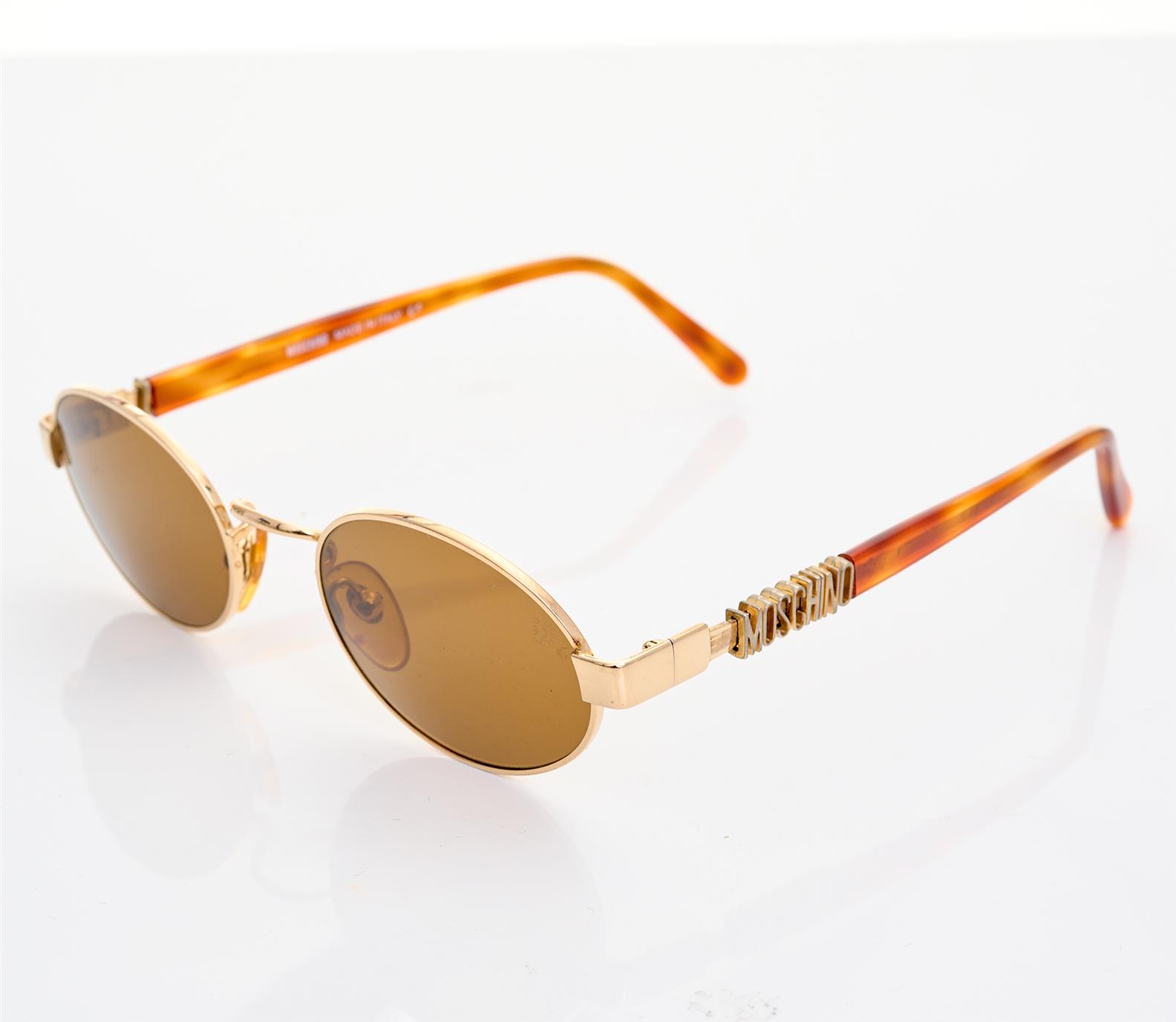 A PAIR OF SUNGLASSES BY MOSCHINO, MADE IN ITALY APPLIED WITH FLEXIBLE MOSCHINO LETTERING TO FAUX TORTOISESHELL ARMS, ACCOMPANIED BY A MOSCHINO CASE