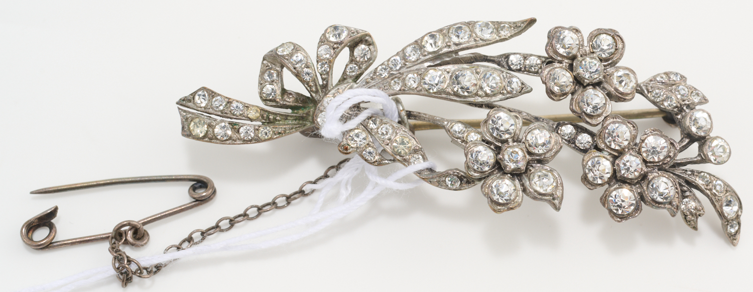 A VINTAGE PASTE SET BROOCH IN STERLING SILVER, TOTAL LENGTH APPROXIMATELY 60MM