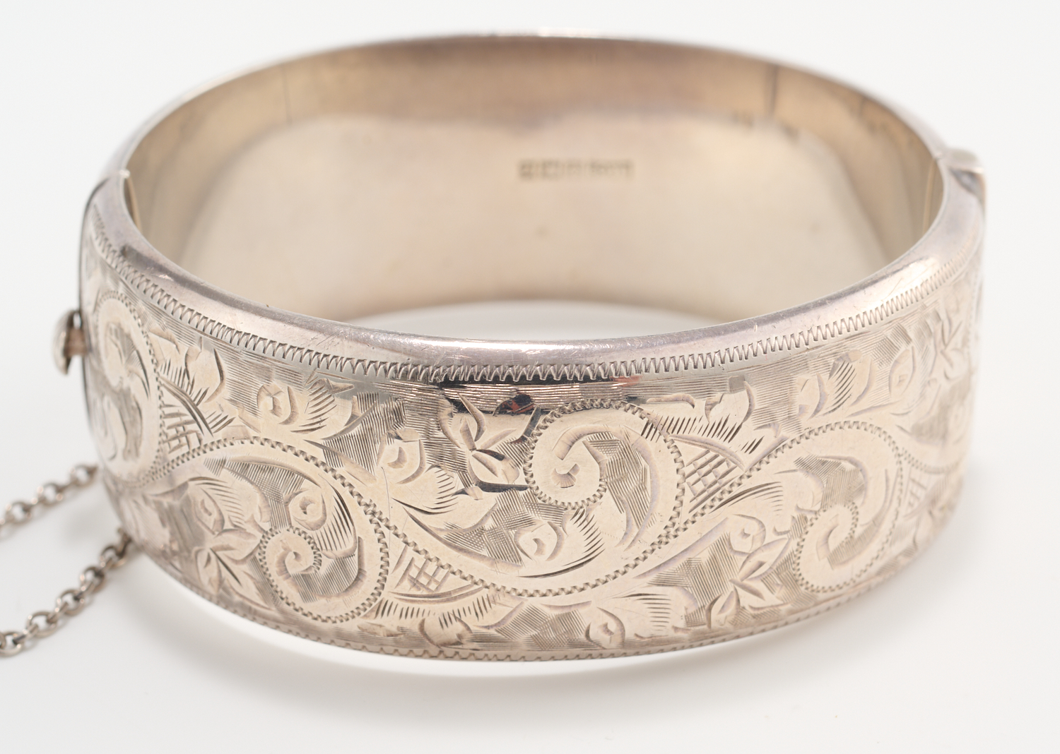 AN ANTIQUE HINGE BANGLE IN STERLING SILVER, HALLMARKED BIRMINGHAM, INNER DIAMETER 64MM