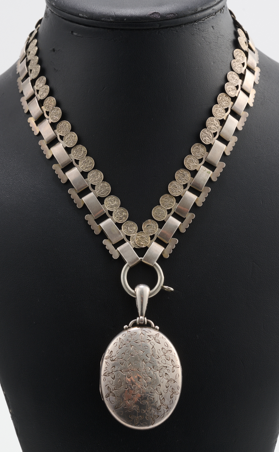 VICTORIAN LOCKET IN STERLING SILVER AND FOB CHAIN IN CONTINENTAL 800 SILVER, TOTAL WEIGHT 59.12GMS, LENGTH 44CM