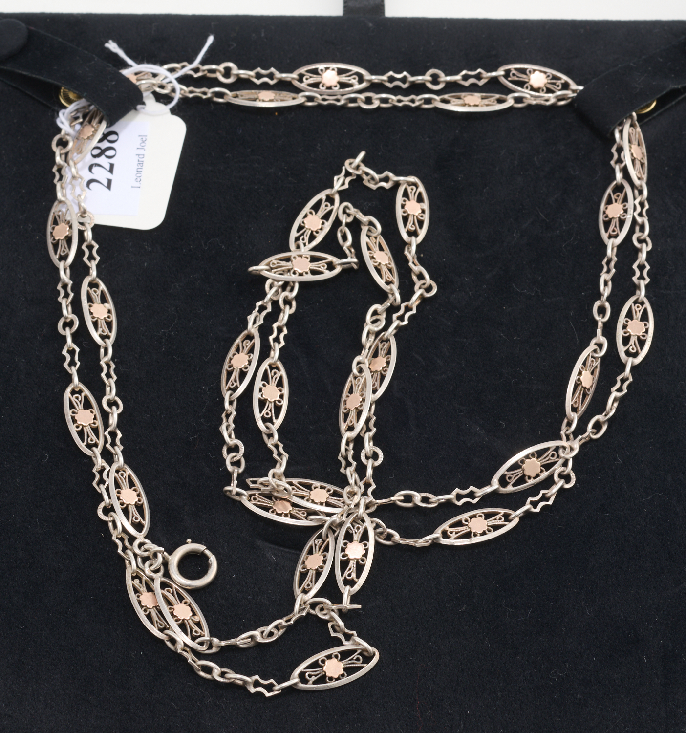 A STERLING SILVER AND COPPER GUARD CHAIN LENGTH 142CM, WEIGHT 34.8GMS