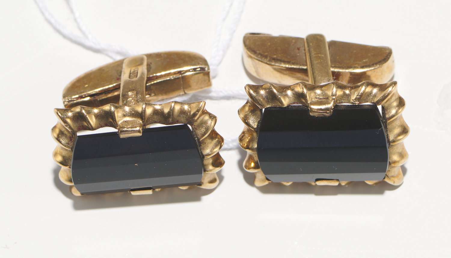 A PAIR OF FACETED ONYX CUFFLINKS IN 9CT GOLD, HALLMARKED