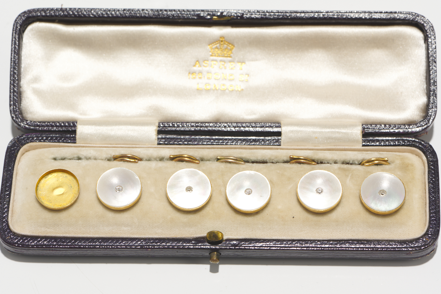 A MOTHER OF PEARL AND DIAMOND SHIRT STUD SET IN 9CT GOLD BY ASPREY, IN ORIGINAL FITTED BOX, A/F