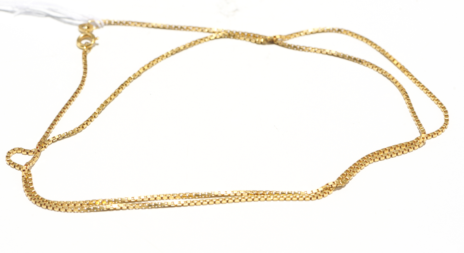 A BOX LINK CHAIN IN 18CT GOLD, TOTAL WEIGHT 7.5GMS, TOTAL LENGTH 60.5CM