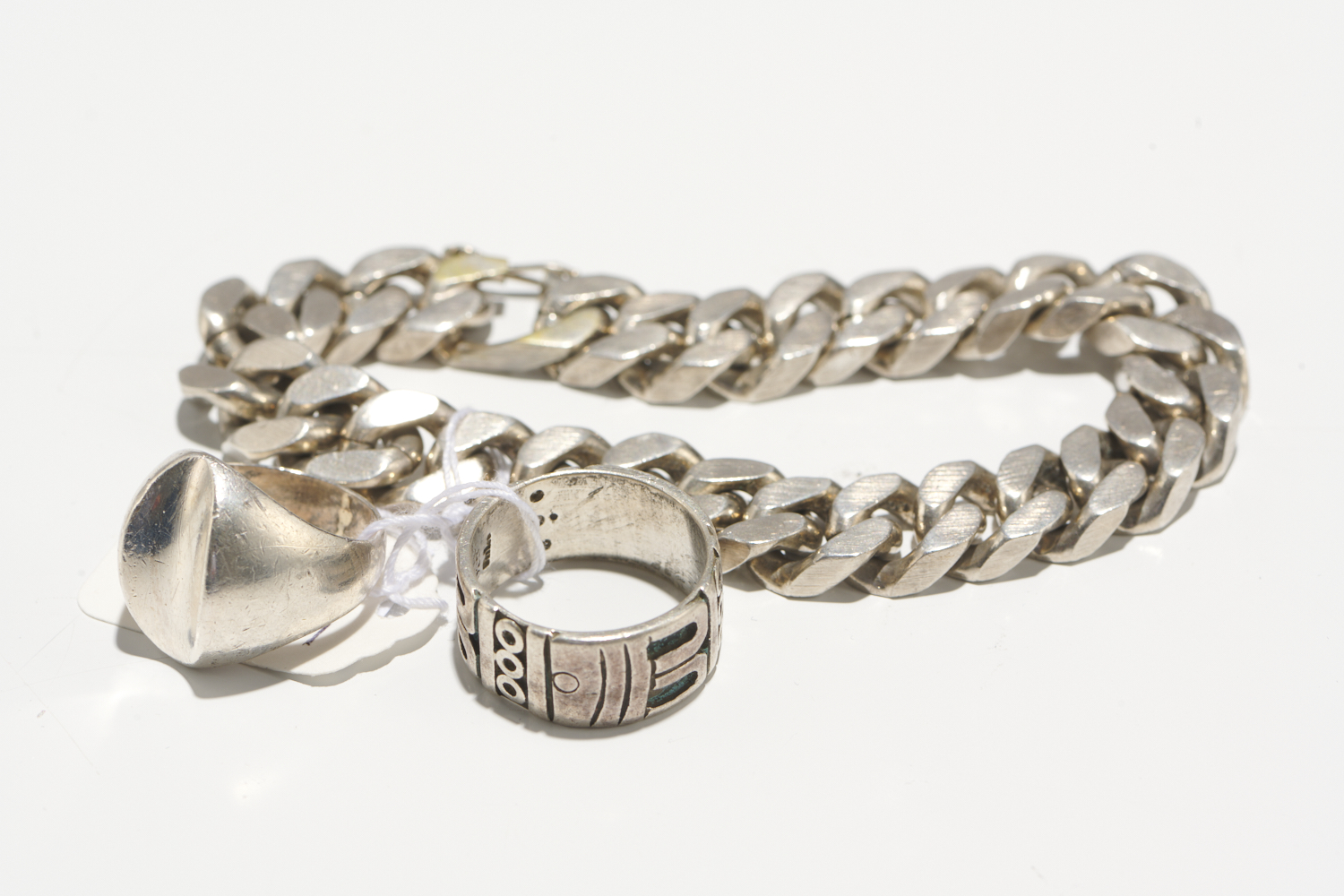 A COLLECTION OF JEWELLERY IN STERLING SILVER, INCLUDING A CURBLINK BRACELET AND RING BY HANS HENSEN