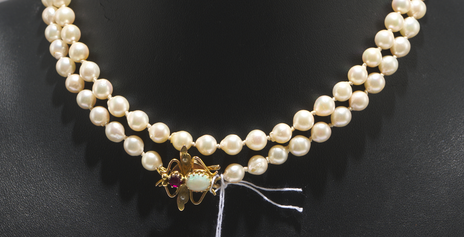 A STRAND OF CULTURED PEARLS TO A INSECT CLASP IN 9CT GOLD SET WITH OPAL, GARNET AND SEED PEARL, TOTAL LENGTH 77CM