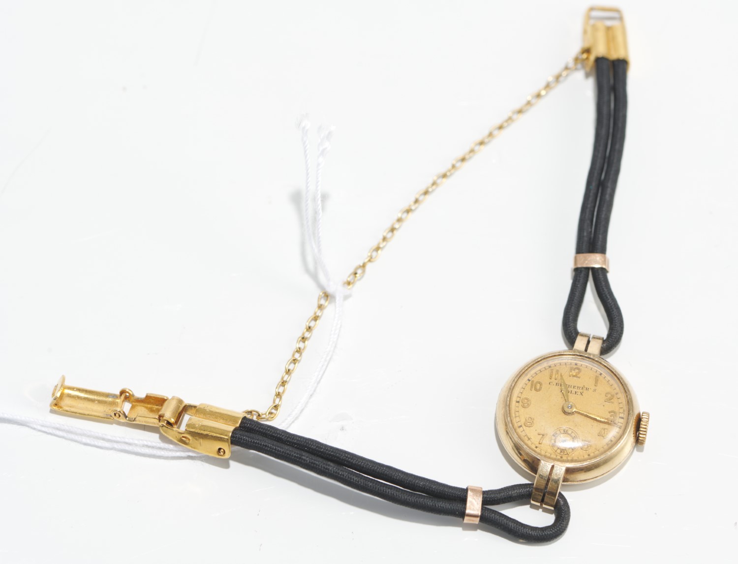 A VINTAGE LADIES MANUAL WIND ROLEX WRISTWATCH WITH BLACK MATERIAL BANDS TO A 9CT GOLD CLASP, (PICTURED ABOVE)